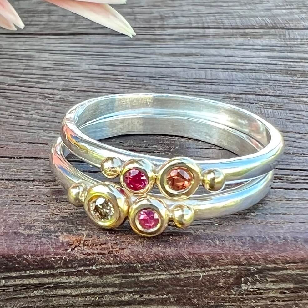 A glittering cluster of color and sparkle, sapphires or diamonds, mounted on a smooth, round ring body, offers natural elegance.